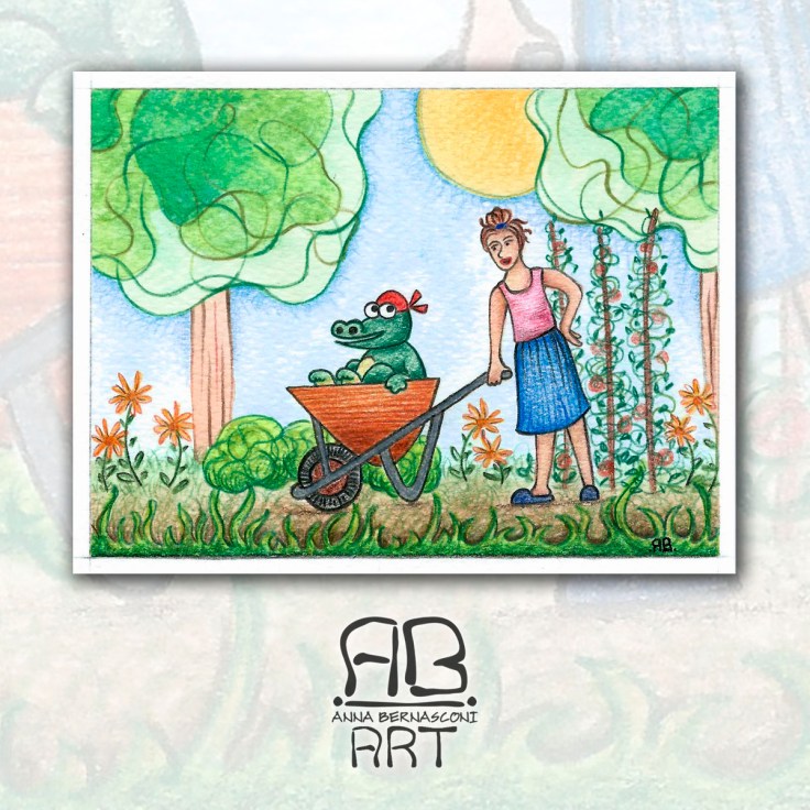 I soggetti vegetali sono tra i miei prediletti, quindi quando Elle mi ha chiesto un’illustrazione-regalo è stata quasi ovvia l’ambientazione che avremmo scelto: lei aveva già disegnato un “logo”: se stessa con una carriola ed il suo Alli e mi ha chiesto di elaborare qualcosa partendo da quello… come potevo non ispirarmi al loro orto?