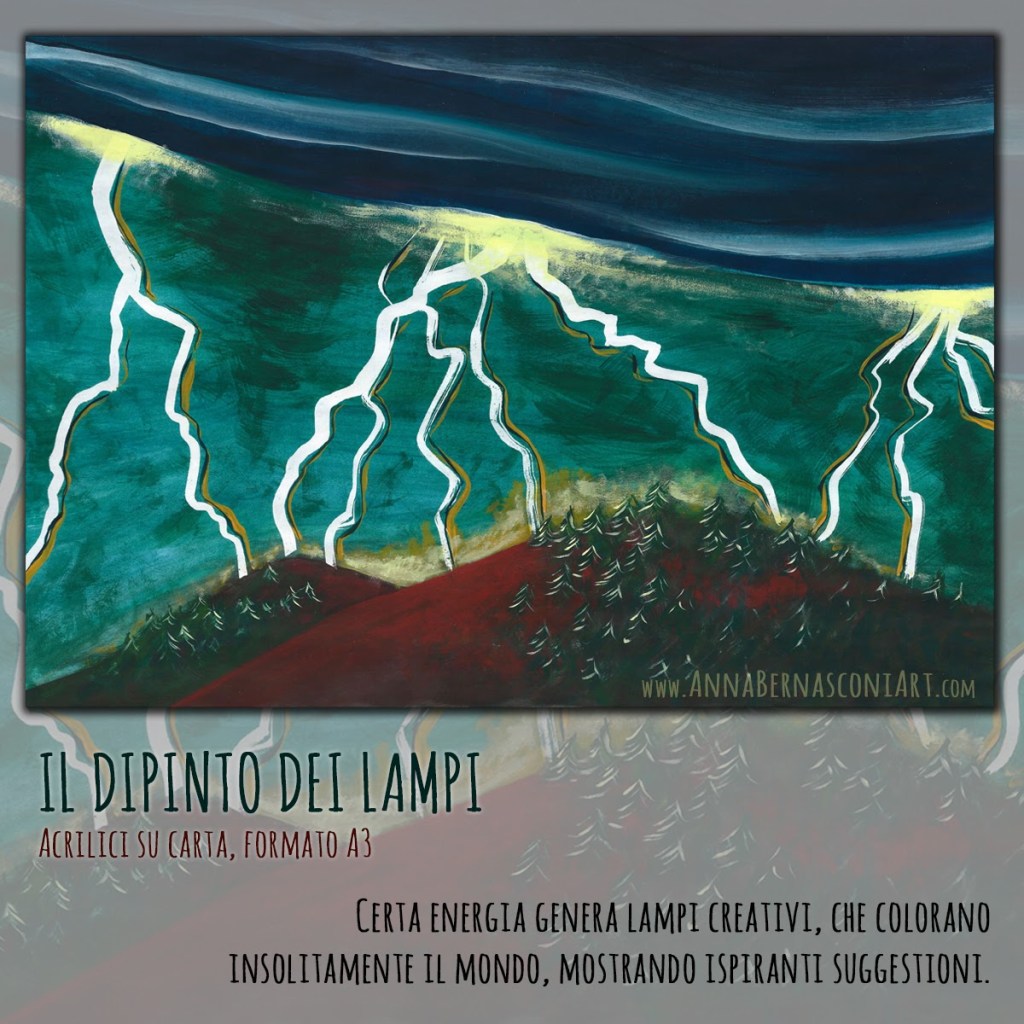 Un dipinto molto interessante, mi piace! C’è tutta l’energia che trasmette un temporale e quei lampi che squarciano il cielo sono al tempo stesso spaventosi, ma affascinanti, ipnotici. La tua frase poi è perfetta Non sempre i miei lampi creativi portano a qualcosa di concreto, però almeno lì per lì “colorano insolitamente il mondo”. Ciao, Anna.