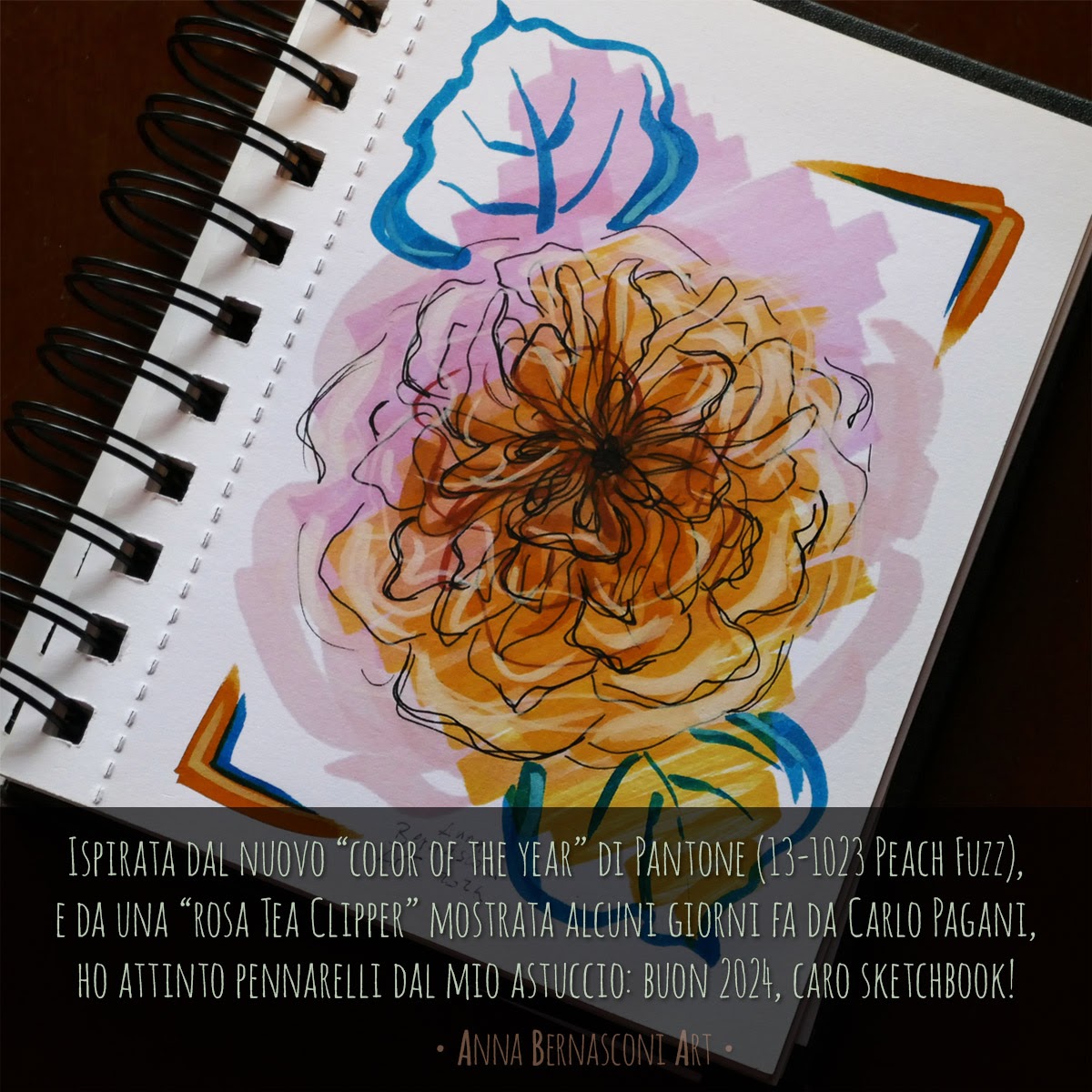 La scelta di Pantone è il primo colore che ogni gennaio vado a cercare e scoprendo questo mi è venuta in mente una rosa Tea Clipper della quale, pochi giorni prima, avevo visto una fotografia sul profilo Facebook di Carlo Pagani (per vederla clicca QUI); mi sono lasciata ispirare da tutto ciò, ho aperto il mio taccuino artistico ed ho attinto dal mio astuccio qualche pennarello: buon 2024, caro sketchbook!